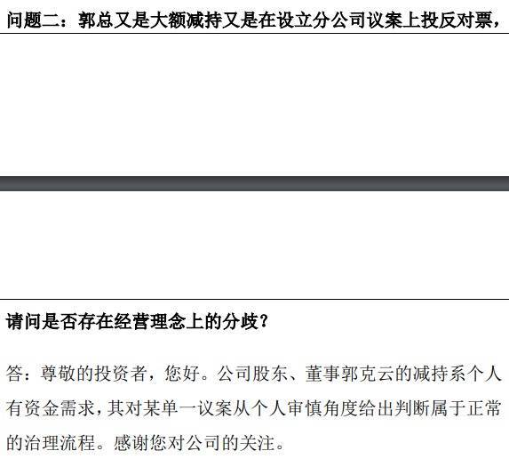 在近日举行的投资者交流活动中,有人向公司发问,郭总(郭克云)又是大额减持又是在设立分公司议案上投出反对票,请问是否存在经营理念上的分歧?