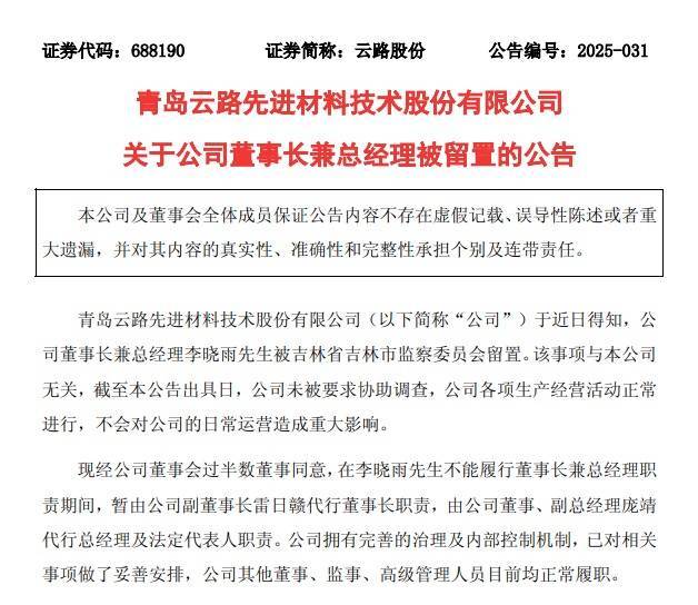 日前,云路股份发布了关于公司董事长兼总经理被留置的公告。该公司于近日得知,公司董事长兼总经理李晓雨被吉林省吉林市监察委员会留置。